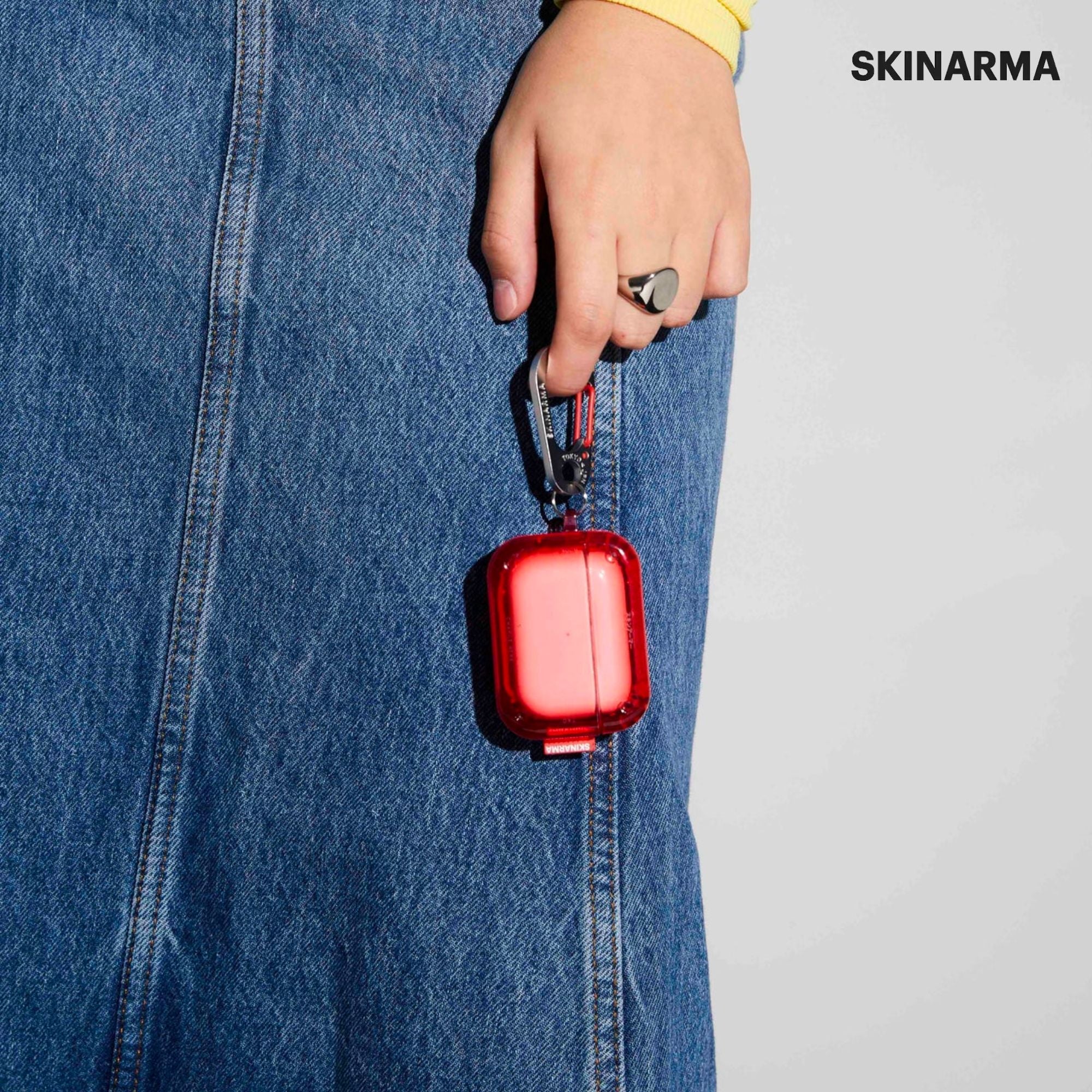 Tough translucent protective case for AirPods Pro featuring SAIDO’s signature vibes, completed with a customized SKRM hook carabiner.
