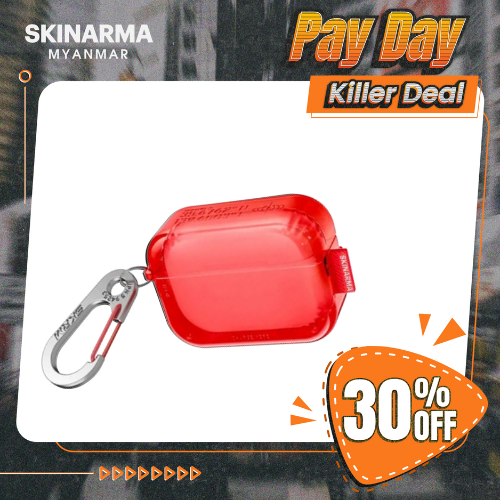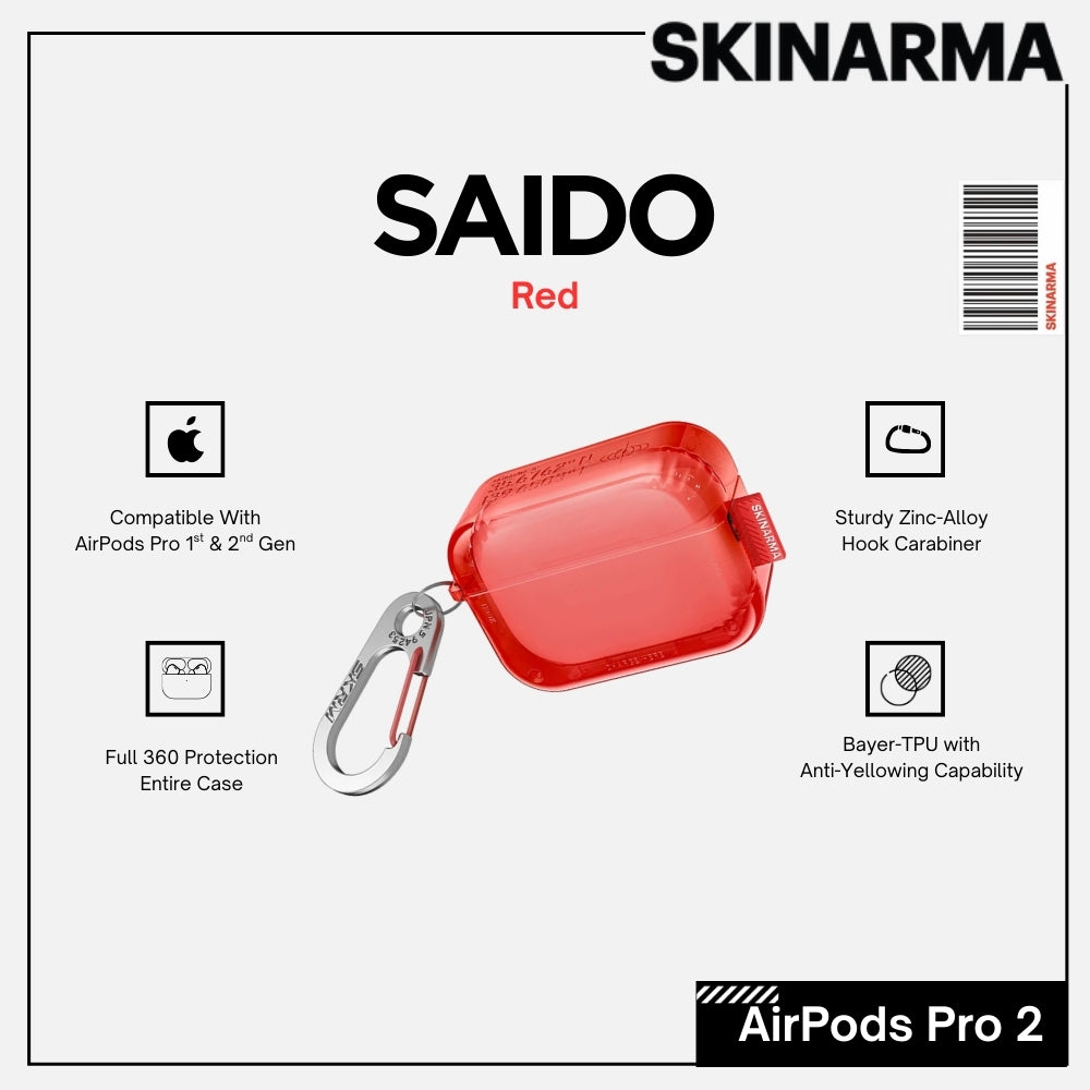 Tough translucent protective case for AirPods Pro featuring SAIDO’s signature vibes, completed with a customized SKRM hook carabiner.